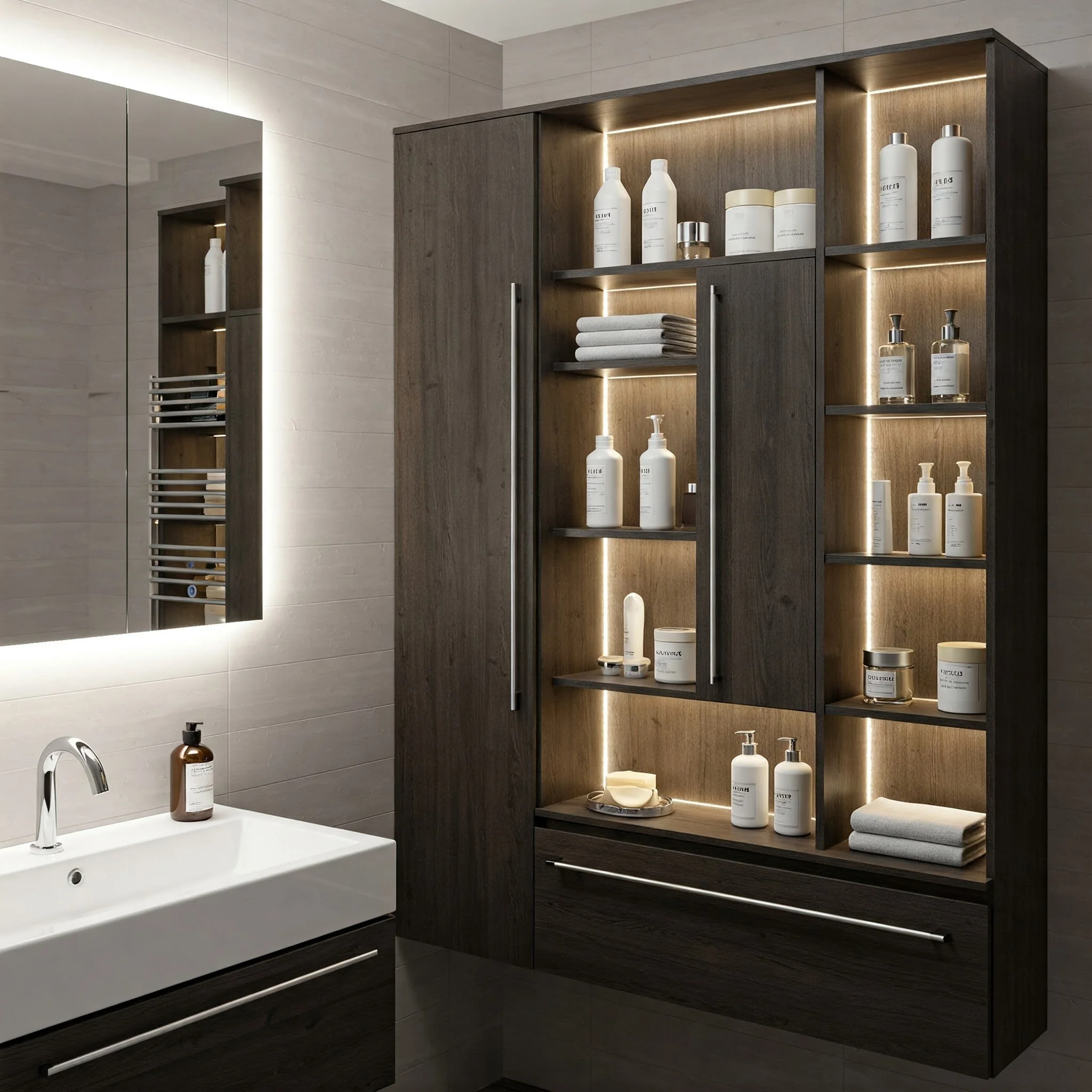Integrating lighting into your wall storage not only enhances functionality but also elevates the overall ambiance of your bathroom. LED strip lights, recessed lighting, or even decorative lamps can be installed alongside shelves and cabinets to highlight your storage solutions. Imagine soft, ambient lighting that accentuates your carefully arranged toiletries and decor, making your bathroom feel warm and inviting. Lighting can transform a simple storage area into a focal point of your design, drawing attention to key elements while also providing practical illumination. This method is akin to setting the stage for a performance—each shelf becomes a spotlighted feature that enhances the room’s atmosphere. By combining storage with well-placed lighting, you create a dynamic environment that is both functional and visually captivating, ensuring that every corner of your bathroom is perfectly showcased and effortlessly organized.