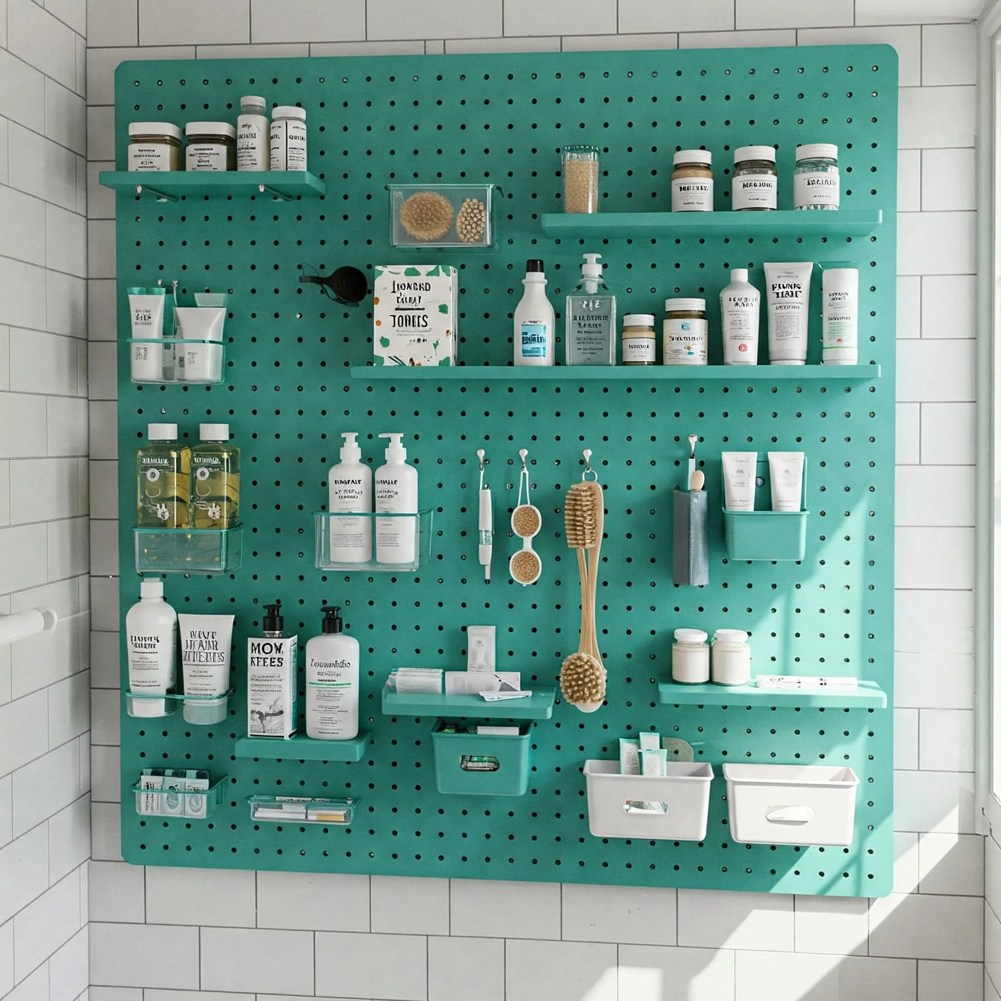 Pegboard wall storage systems are a versatile and dynamic solution for organizing bathroom essentials. With a pegboard, you can easily customize the layout by inserting hooks, baskets, and shelves to hold a variety of items. Imagine a pegboard that adapts to your changing needs—a modular display that holds everything from hair accessories and makeup brushes to cleaning tools. This system is ideal for those who love a hands-on approach to organization, as you can rearrange components whenever inspiration strikes. Pegboards are not only functional but also add an industrial-chic aesthetic to your bathroom, turning an ordinary wall into a personalized storage masterpiece. Their open design ensures that items remain visible and easily accessible, making your morning routine smoother and more efficient. Embracing a pegboard system is like having a flexible command center that evolves with your lifestyle and keeps your bathroom impeccably organized.