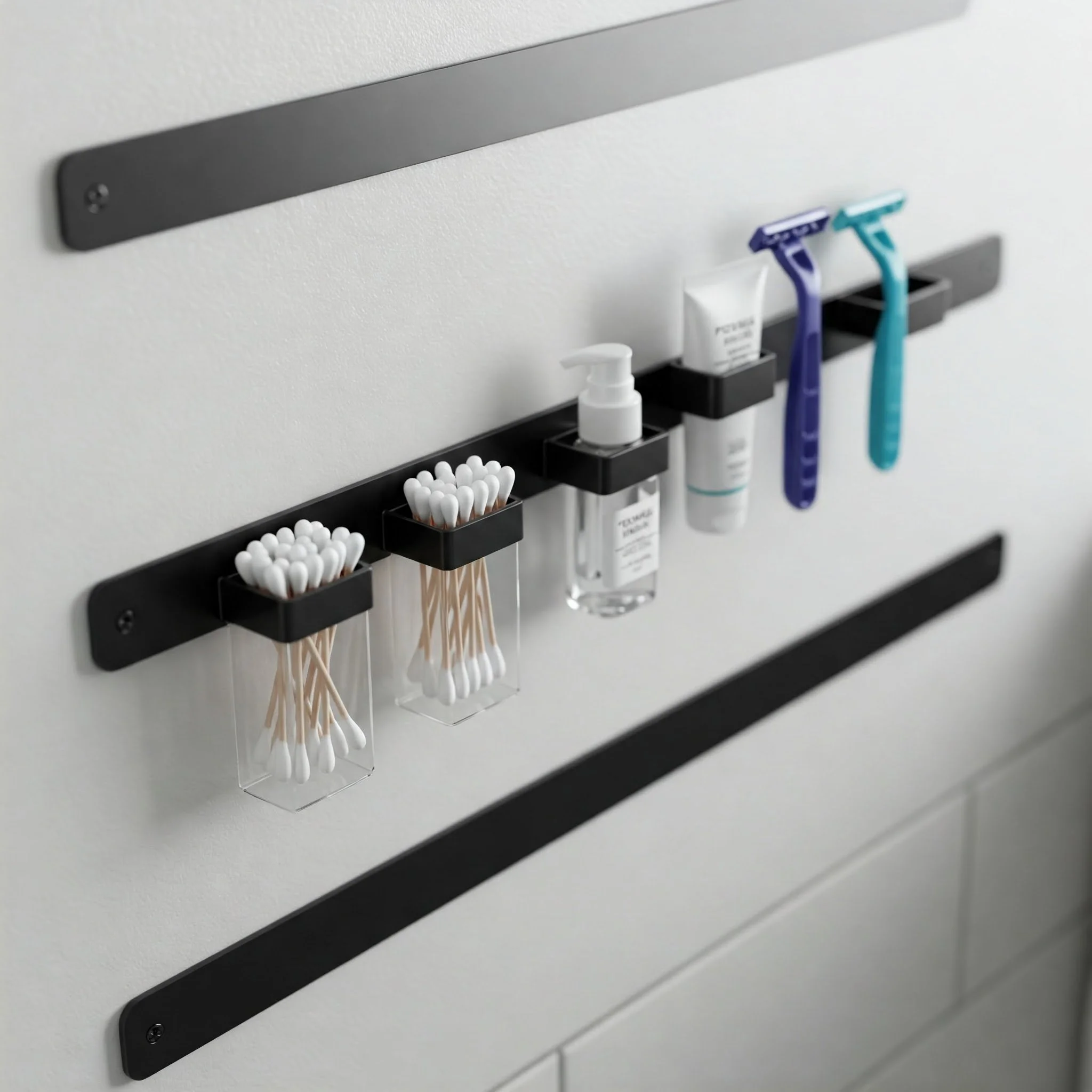 Magnetic strips offer an innovative way to organize small metal essentials in your bathroom. They’re perfect for holding tweezers, nail clippers, bobby pins, and even small scissors. Imagine a sleek magnetic strip installed on your wall that keeps these everyday items secure and visible, eliminating the frustration of searching for misplaced tools. This storage solution is both functional and stylish, as it transforms a mundane tool organizer into a design feature. Magnetic strips also help to declutter countertops, ensuring that your bathroom remains pristine and inviting. Their installation is straightforward, and they come in various finishes to complement your decor. With magnetic strips, you’re not only storing items—you’re curating a small gallery of essential tools that are always within arm’s reach, simplifying your grooming routine in a smart, efficient manner.