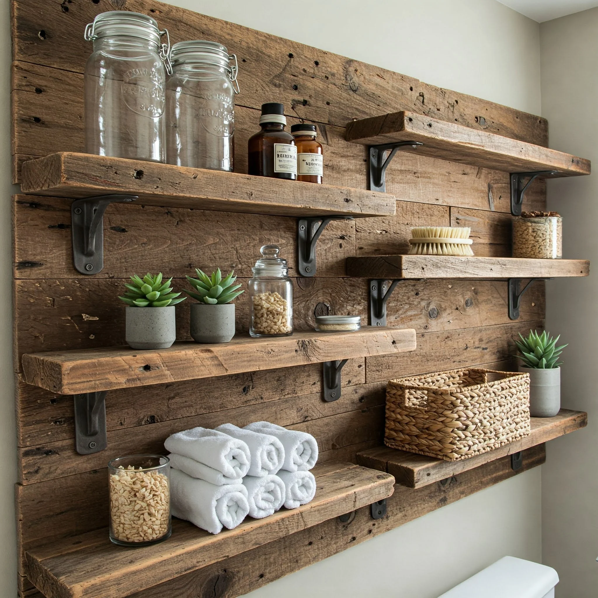 Incorporating reclaimed wood into your bathroom wall storage brings warmth and character to the space. Reclaimed wood, with its natural textures and history, can be transformed into shelves, racks, or decorative accents that offer both style and storage. Imagine a set of rustic wooden shelves that not only display your favorite bath products but also infuse your bathroom with a cozy, earthy vibe. This approach is perfect for those who appreciate a blend of sustainability and design, as reclaimed wood adds a unique touch that new materials simply can’t match. The natural imperfections of the wood create a focal point, drawing the eye while providing functional storage. Using reclaimed wood for wall storage is like inviting nature into your home—a timeless, environmentally friendly solution that elevates your bathroom’s aesthetic while keeping it organized and charming.