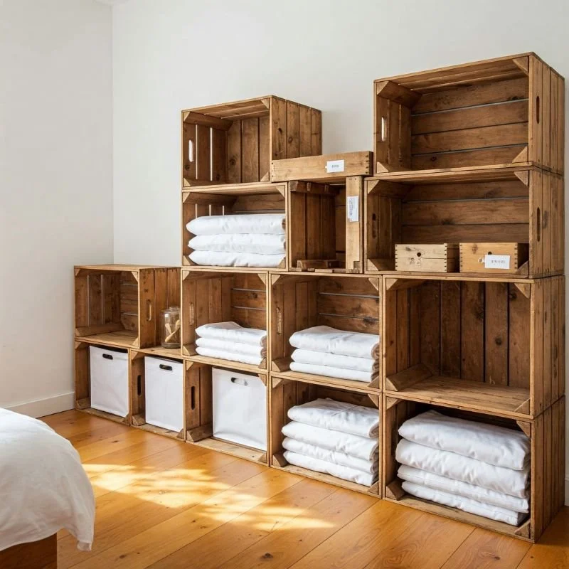 Elevate your storage game with a sustainable solution that brings rustic charm to linen organization – transformed wooden wine crates. These sturdy boxes, often available for free from liquor stores or wine shops, provide the perfect dimensions for neatly folded sheet sets. Mount them horizontally on a bedroom or closet wall, creating a modular storage system that's both functional and decorative. Isn't it satisfying when storage doubles as art? I recommend sanding the rough edges and applying a light stain or paint to complement your decor. The divided sections originally designed for wine bottles create natural compartments for separating twin, queen, and king sets. Label each crate by size, season, or guest room destination for added organization. This approach works particularly well for those who appreciate visible storage systems that encourage maintaining order – it's hard to stuff sheets messily into a display that's part of your decor!