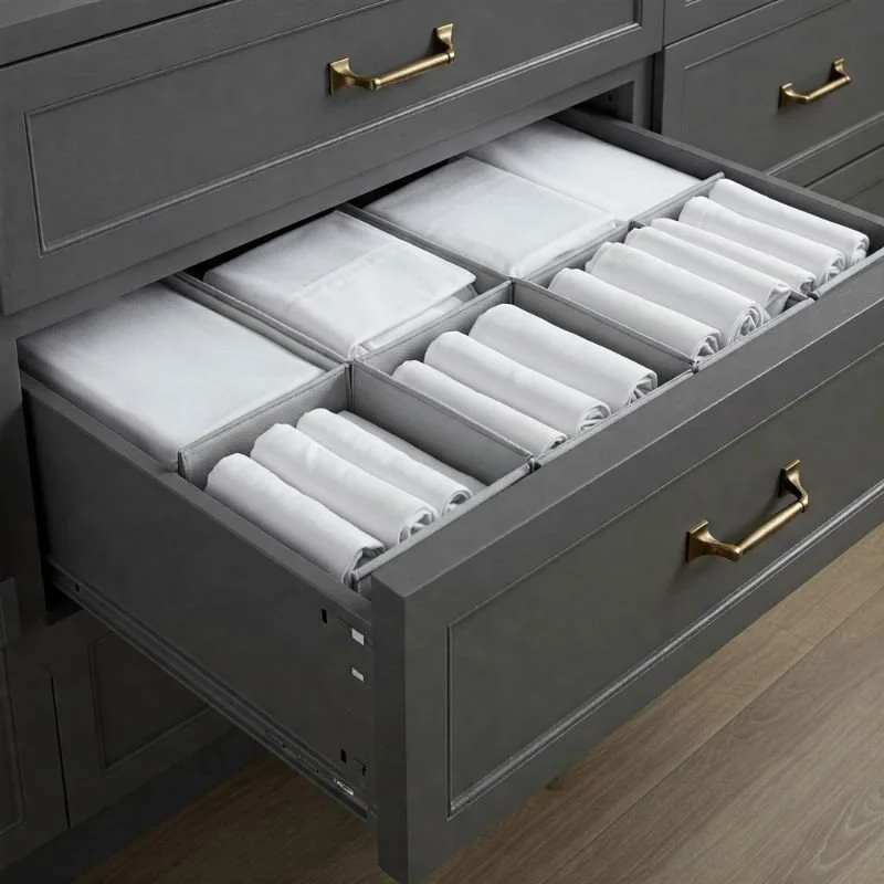 Revolutionize drawer storage with a method borrowed from clothing organization gurus – the file-folding system. Rather than stacking sheets horizontally (where retrieving one inevitably disrupts the entire pile), fold them into uniform rectangles that stand vertically in your drawer, resembling a filing cabinet. Can you imagine seeing every sheet set at once without unstacking anything? The transformation starts with custom drawer dividers – either purpose-made adjustable versions or DIY solutions using sturdy cardboard covered in contact paper. These create stable sections that keep your vertical sheet "files" from slumping over. I recommend grouping by size or color within each section for intuitive access. This system maximizes drawer capacity while minimizing the frustration of searching for specific sets. The visual accessibility encourages maintaining organization long-term, as you can immediately see when something is out of place – sheet storage that subtly enforces its own organization system!