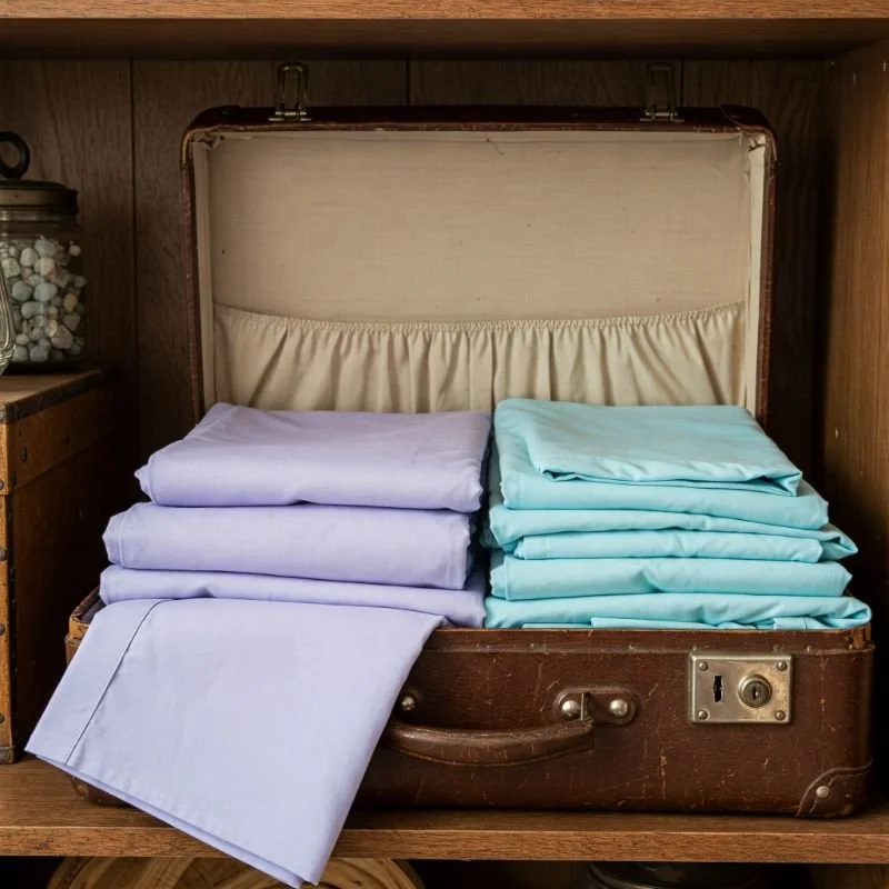 Transform nostalgic finds into functional storage with vintage suitcases that house your sheet collections while adding character to your bedroom. These romantic relics of travel's golden age offer rigid protection for linens while creating a decorative element that can be displayed openly rather than hidden away. Stack them at varying angles beside your dresser, place a single statement piece on a luggage rack, or tuck them partially visible under your bed. Doesn't good storage deserve to be seen rather than hidden? I suggest lining older suitcases with acid-free tissue or cotton fabric to protect sheets from any interior deterioration, and adding lavender sachets for freshness. The naturally divided compartments in many vintage cases create intuitive organization opportunities for separating different sheet types. This approach particularly suits those who appreciate storage solutions with history and personality – each case brings its own story while writing a new chapter as the keeper of your linens.