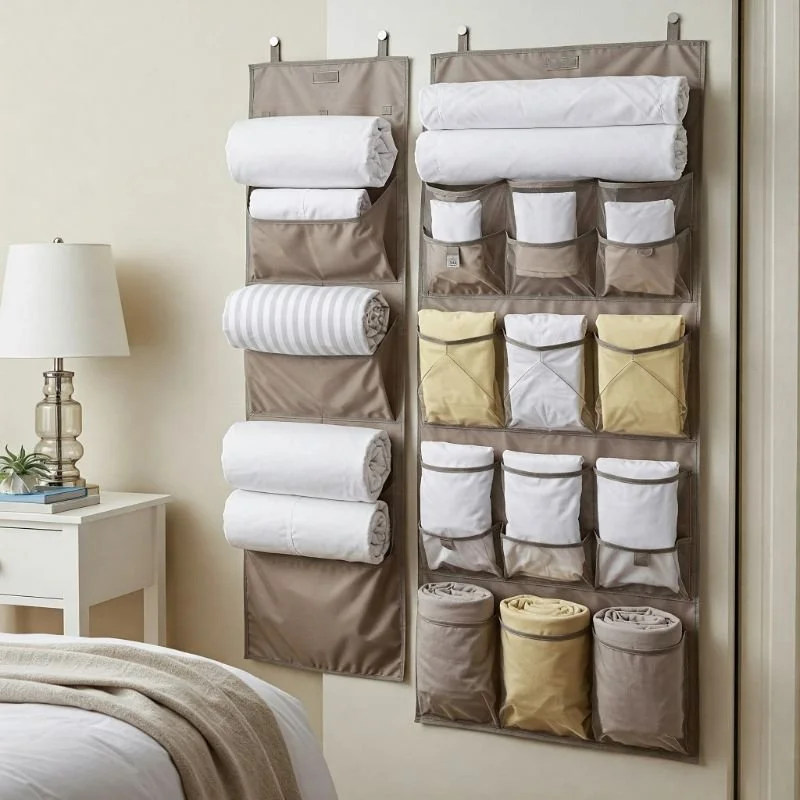 Capitalize on overlooked door real estate with hanging pocket organizers that turn this vertical surface into prime sheet storage territory. Originally designed for shoes, these multi-pocket canvas or mesh organizers perfectly accommodate folded sheet sets, with each pocket holding a complete set or individual components organized by type. Imagine transforming that forgotten door surface into an organizational command center for all your bedding needs! I particularly recommend clear-pocket versions that allow visibility of contents without opening each compartment, coupled with a labeling system for ultimate efficiency. For standard-size sheet sets, try filing each set into individual pockets; for larger king sets, dedicate one pocket to fitted sheets, another to flat sheets, and a third to pillowcases. This solution shines in small spaces where traditional storage is limited, or as supplemental organization for guest room closets. The flexibility allows customization to your specific needs while utilizing space that would otherwise remain completely unused.
