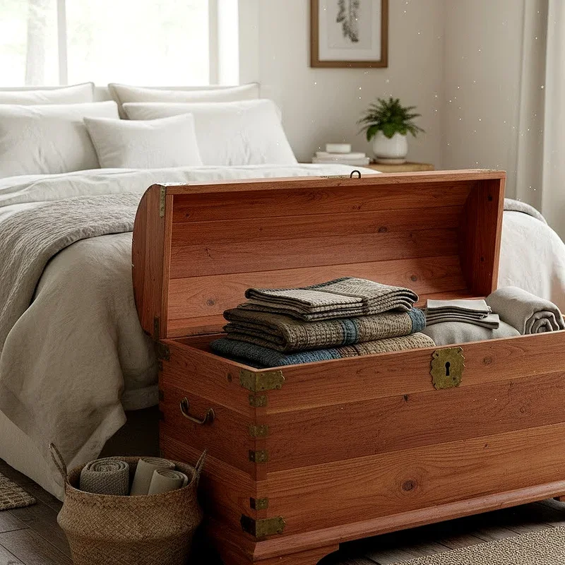 Cedar chests and trunks provide traditional, elegant storage solutions that naturally protect your bedding from moths and mustiness. The aromatic cedar wood repels insects while absorbing excess moisture, keeping your linens fresh even during long-term storage. These substantial pieces often become beautiful focal points at the foot of your bed or along a bedroom wall. Beyond their practical function, cedar chests carry nostalgic charm and can become family heirlooms passed down through generations. Modern versions combine the benefits of cedar with contemporary designs that suit any decor style. The spacious interior accommodates bulky comforters, quilts, and multiple sheet sets, while the flat top surface provides bonus seating or display space for bedroom accessories.