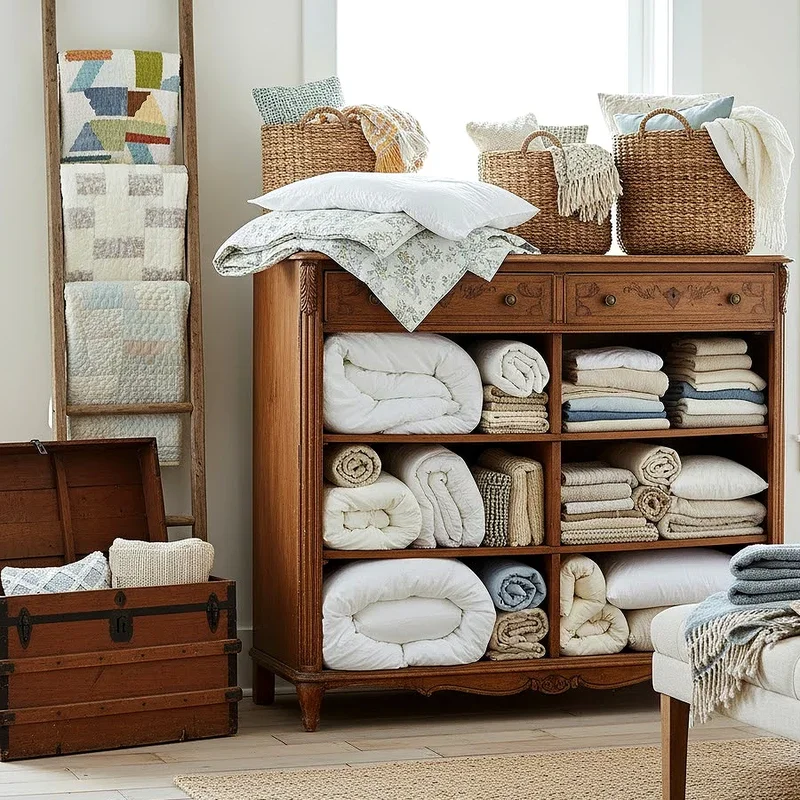Repurposed furniture storage breathes new life into vintage pieces while solving your bedding organization challenges creatively. Old dressers, armoires, buffets, or console tables can become dedicated linen storage with some thoughtful arrangement. You might transform a vintage trunk into a nightstand with bedding storage inside, or convert an old bookcase into a linen closet with added baskets. This approach allows you to express your personal style while being environmentally conscious and budget-friendly. Repurposed pieces often feature superior craftsmanship compared to modern equivalents, giving you storage solutions that last for decades. The unique character of vintage furniture adds personality to your bedroom that mass-produced storage containers simply cannot match.