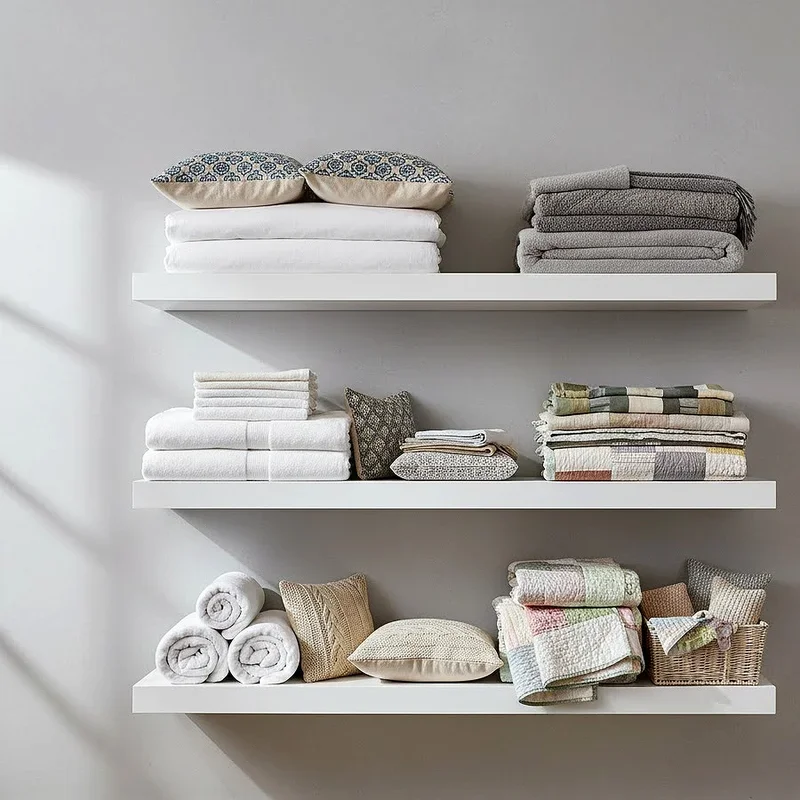 Wall-mounted shelving units provide vertical storage that doesn't consume valuable floor space in your bedroom. These floating shelves create designated spots for neatly folded blankets, decorative throws, and even rolled sheets arranged by size or color. Installing shelves above doorways, in corners, or along empty wall spaces maximizes every inch of your room. You can style open shelving with attractive storage boxes or baskets that conceal bedding while adding visual interest to your walls. This approach works particularly well in smaller bedrooms where floor space comes at a premium. The elevated position keeps bedding fresh and clean while making your organizational system part of your room's aesthetic appeal.