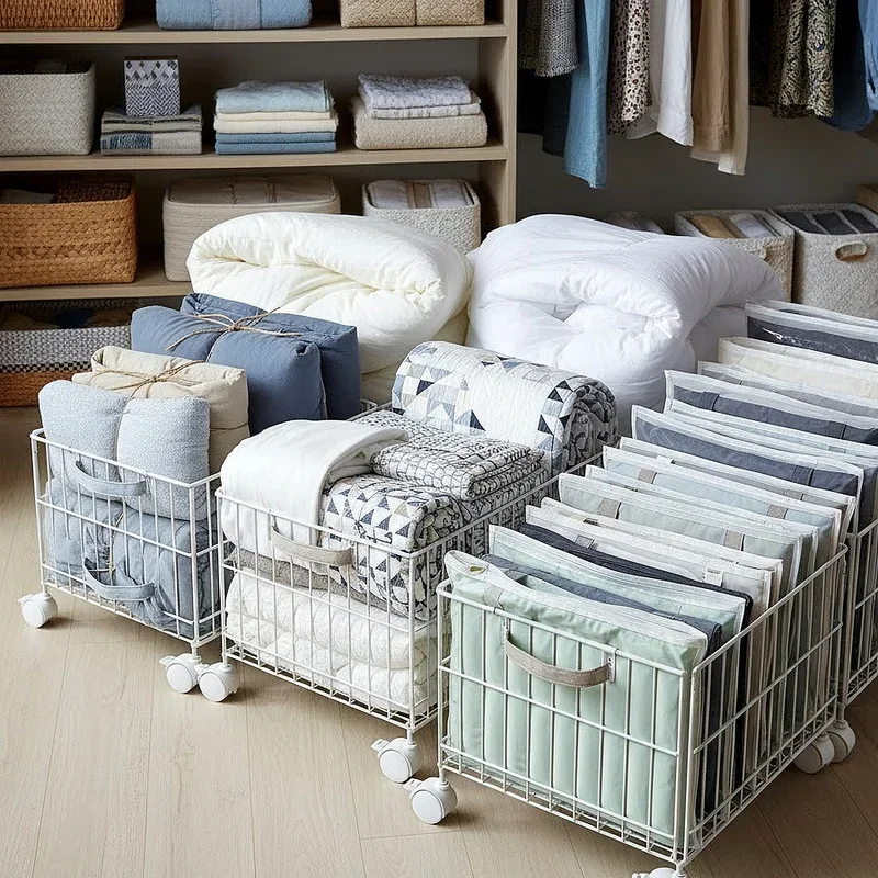 Stackable storage bins create modular bedding storage systems that adapt to your changing needs and available space. These uniform containers stack securely atop each other, allowing you to build vertical storage towers in closets, corners, or under tables. You can label each bin clearly, designating specific containers for guest bedding, seasonal items, or different sheet sizes. Many bins feature clear sides or windows that let you see contents without opening them. The stackable design makes efficient use of vertical space while keeping everything organized and protected from dust. When you need a particular item, simply unstack the bins, retrieve what you need, and rebuild your tower in seconds.