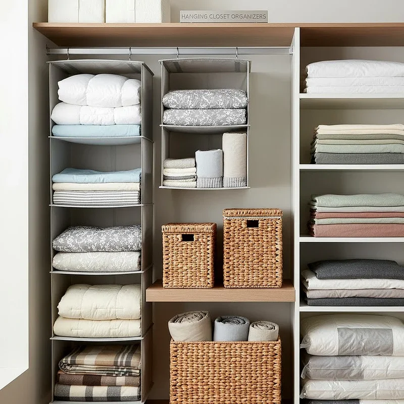 Hanging closet organizers utilize vertical space inside your closet by suspending from the clothing rod. These fabric shelving units typically feature multiple compartments where you can store folded sheets, pillowcases, and lightweight blankets. The hanging design makes installation completely tool-free, simply loop the organizer over your existing closet rod and start filling the shelves. You can dedicate different compartments to various sheet sizes or bedding types, creating an organized system that makes finding items effortless. This solution works particularly well in closets where floor and shelf space are already claimed by other storage needs. Many organizers include clear vinyl windows or label holders, helping you identify contents at a glance without disrupting your careful folding.