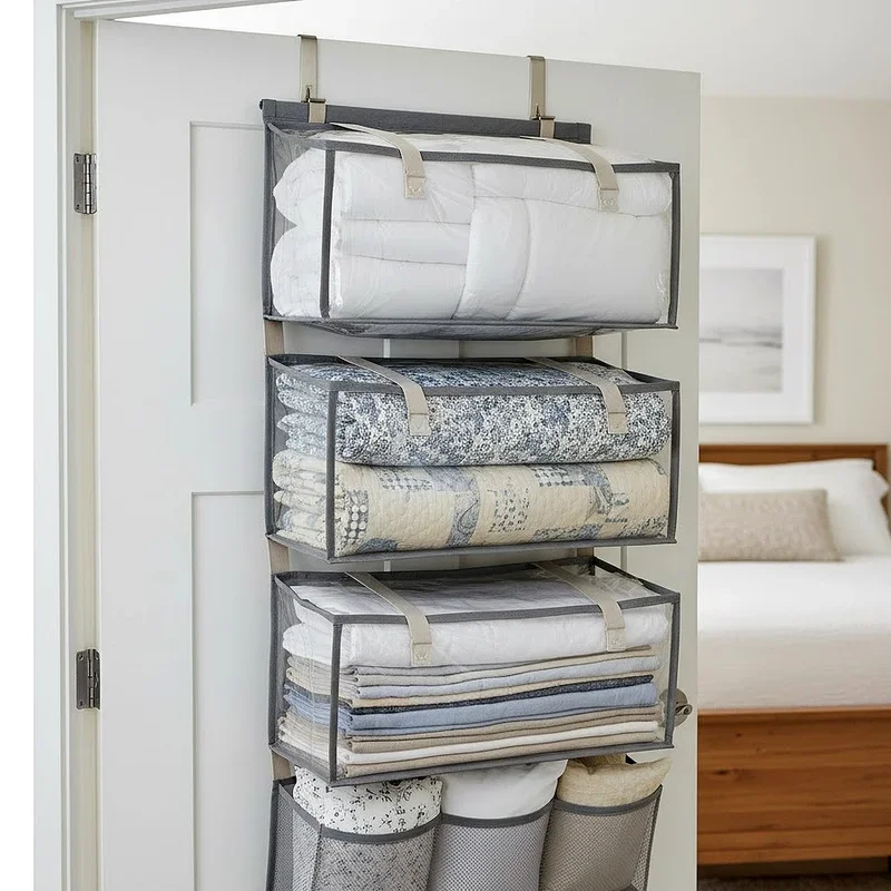 Behind-the-door storage transforms forgotten space into valuable bedding organization real estate. These over-the-door organizers hang from the top of your bedroom or closet door, featuring pockets or shelves for storing smaller bedding items. You can keep pillowcases, decorative pillow covers, or lightweight throws neatly arranged and instantly accessible. This solution requires no installation or hardware, making it perfect for renters or those who avoid drilling holes. The slim profile ensures doors still close properly while maximizing storage potential. Some designs include adjustable shelves or customizable pocket arrangements, allowing you to configure the storage to match your specific bedding collection and organizational preferences perfectly.