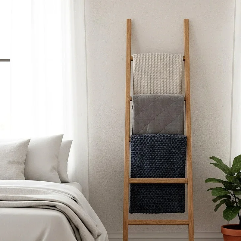 Blanket ladders bring a trendy, rustic charm to your bedroom while providing practical storage for your favorite throws and blankets. These leaning ladder-style racks typically feature four to six rungs where you can drape blankets decoratively. The open design allows air circulation, keeping textiles fresh while making them easily accessible for chilly evenings. You can position a blanket ladder in an empty corner, beside a reading chair, or near the foot of your bed. This storage method works best for blankets and throws you use regularly rather than guest bedding or seasonal items. The vertical design takes up minimal floor space while adding architectural interest and texture to your bedroom decor.