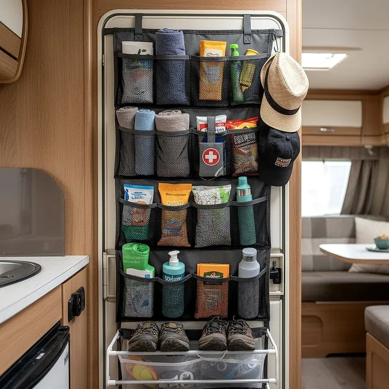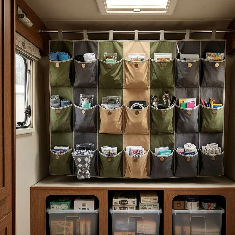 Hanging shoe organizers aren't just for footwear; they organize almost anything efficiently. These multi-pocket organizers hang in closets, on walls, or behind doors storing various items. Each pocket becomes a designated spot, maintaining organization and quick access. Clear pocket versions let you see contents without digging through everything. Dedicate organizers to bathroom items, snacks, or small tools separately. This prevents small items from getting lost in larger storage areas. Organizers typically install without tools using hooks or adhesive strips. They prevent items from shifting during travel since pockets hold contents securely. This addition dramatically reduces clutter making caravans feel more organized. Choose organizers with appropriately sized pockets for your intended items.