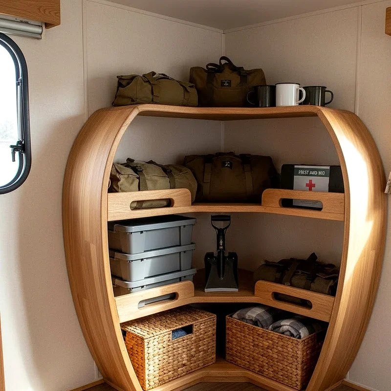 Corners often become dead spaces collecting dust rather than serving practical purposes. Installing corner shelves or rotating organizers transforms awkward areas into valuable storage. Triangular shelves fit perfectly holding spices, toiletries, decorative items, or small electronics. Lazy Susan organizers work brilliantly in corner cabinets allowing back-item access without removing everything. These rotating shelves are particularly useful in kitchens for condiments or canned goods. Use corner hanging baskets in bathrooms for towels or cleaning supplies. Select storage solutions specifically designed for corners rather than forcing rectangular containers. Install corner shelves at varying heights creating visual interest while maximizing capacity. This approach ensures every caravan inch contributes to organization rather than remaining unused.