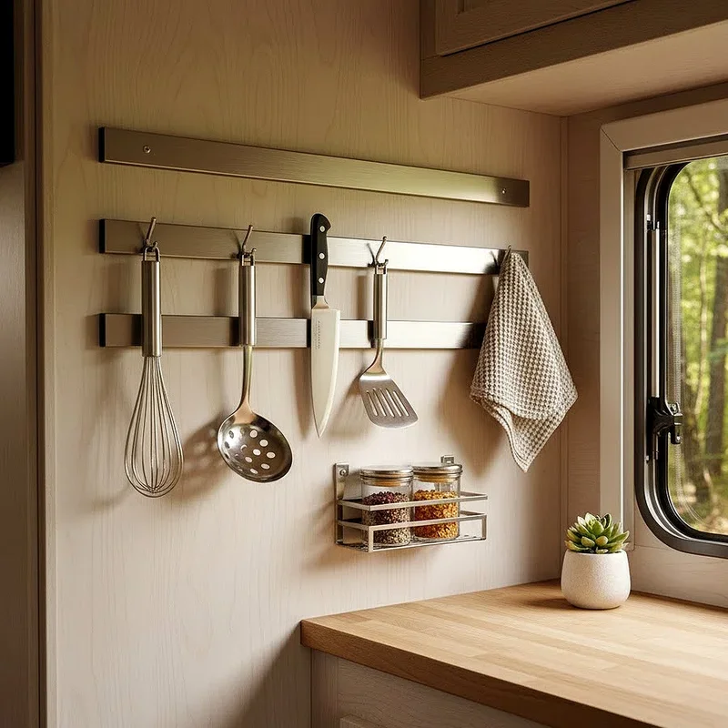 Magnetic strips mounted on kitchen walls organize metal utensils and knives efficiently. This solution keeps frequently used items within reach while freeing drawer space. Strips prevent utensils from rattling during travel, solving common caravan frustrations. Installation requires only adhesive backing or few small screws. Arrange tools by frequency of use for efficient meal preparation. Visual accessibility means you'll immediately notice missing or dirty items. Magnetic storage utilizes vertical wall space often wasted in compact kitchens. Use multiple strips at different heights for various tool lengths. Mount strips inside cabinet doors for hidden storage options. This simple addition transforms cluttered drawers into organized displays, making cooking feel almost like home.
