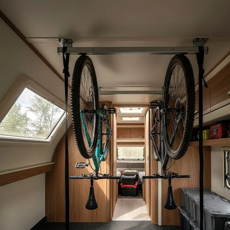 Ceiling-mounted bike racks lift bicycles overhead, freeing valuable floor area while securing equipment. These racks use pulley systems or hooks holding bikes horizontally against ceilings. Installation requires proper anchoring into ceiling joists supporting weight safely. Some designs allow easy lowering when needed and hoisting back with minimal effort. This method works for one or multiple bikes depending on ceiling space. Similar ceiling systems hold surfboards, skis, or other long sporting equipment. Overhead storage protects expensive gear while maintaining clear pathways throughout living spaces. Verify your caravan's ceiling structure can support additional weight before installation. Always follow manufacturer guidelines for safe mounting. This solution proves thinking three-dimensionally creates unexpected storage possibilities effectively.