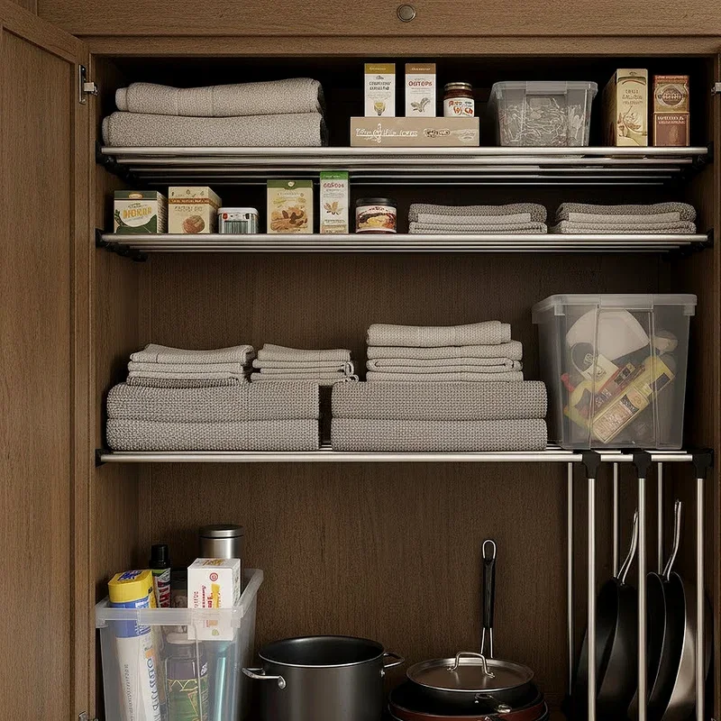 Tension rods create instant storage solutions without drilling holes or permanent installations. Place them vertically between surfaces creating cabinet dividers or horizontally adding shelving layers. In kitchens, vertical rods hold lids, cutting boards, or baking sheets upright. Under sinks, they support spray bottles freeing cabinet floor space. Use them in closets creating double hanging space for shorter items. Adjustable tension rods fit various spaces perfectly and move without leaving marks. Some owners use them near ceilings hanging lightweight items or creating displays. Friction-based systems hold items securely during travel when not overloaded. This affordable solution proves effective storage doesn't require expensive custom installations or permanent vehicle modifications.