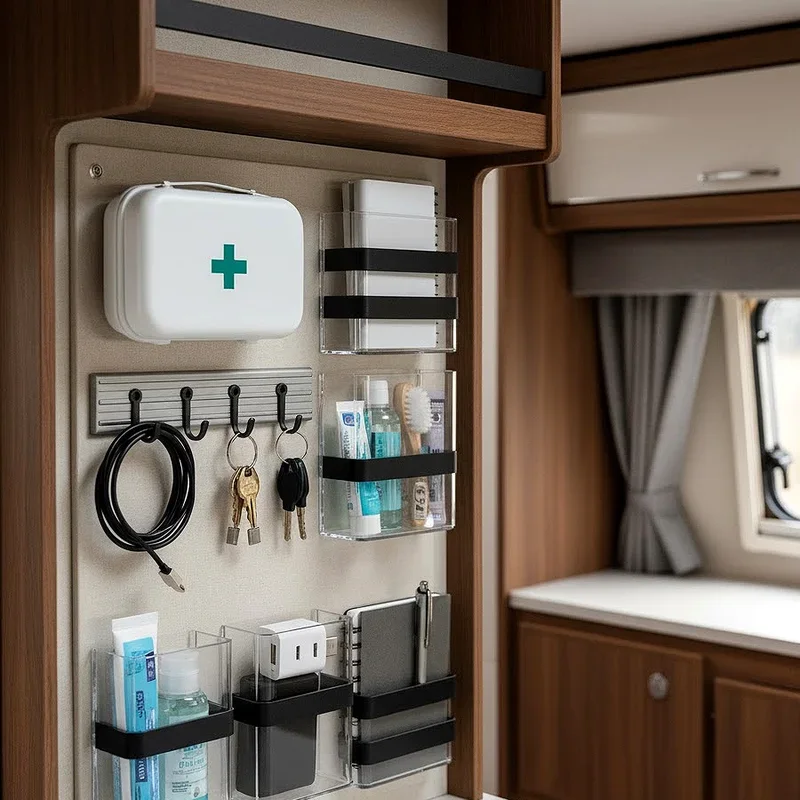 A designated command center organizes small daily items preventing them from scattering throughout caravans. This centralized system includes hooks for keys, pockets for mail, and slots for devices. Create this center near entrances using wall-mounted organizers, pegboards, or combination systems. Having one spot for essentials eliminates time wasted searching for keys, sunglasses, or wallets. Command centers maintain cleanliness by giving everything a home rather than accumulating on surfaces. Include small baskets for daily items needing processing like receipts or notes. Some travelers add whiteboards for messages or tracking tasks and supplies. This organizational hub becomes your caravan's nerve center, streamlining daily routines. The psychological benefit of knowing where important items are reduces stress significantly.