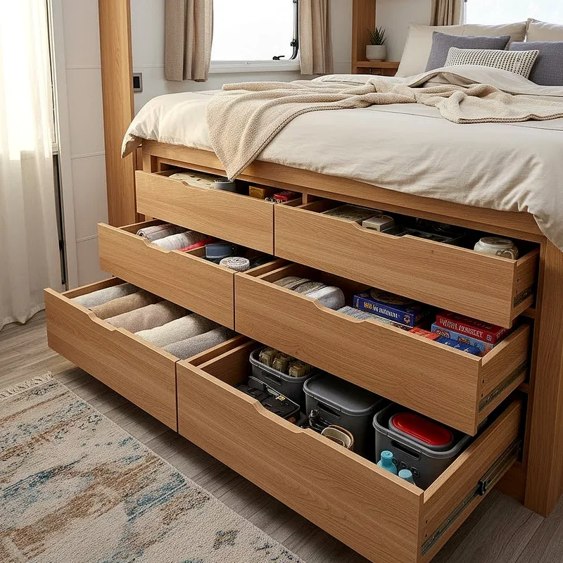 Under-bed space represents one of the largest untapped storage areas in caravans. Installing rolling drawers keeps items dust-free and accessible without lifting mattresses. This area works perfectly for clothing, shoes, bedding, or regularly needed items. Use drawer dividers preventing items from sliding during travel. If lacking built-in storage, create your own using wheeled containers sliding smoothly. Measure available space accurately before purchasing storage solutions ensuring proper fit. Some travelers build custom drawer systems with compartments for specific items. This solution utilizes otherwise wasted space while maintaining sleeping comfort. Think of it as adding a hidden closet beneath your resting place. Choose low-profile containers maximizing available height clearance.