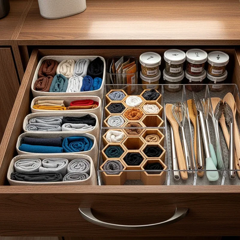 Drawer dividers create compartments preventing items from becoming jumbled messes. They separate specific items, eliminating frustrating searches through tangled utensils or mixed clothing. Adjustable dividers accommodate different drawer sizes and reconfigure as needs evolve. In kitchens, dividers separate utensils and gadgets for quick access. Bedroom drawers benefit from dividers organizing socks, undergarments, and accessories neatly. Purchase commercial organizers or create custom solutions using small boxes or containers. Organized drawers save time and reduce stress, especially during morning preparations. Dividers prevent items from shifting during travel, maintaining order upon arrival. This simple tool multiplies existing storage effectiveness without requiring additional space. Think of dividers as giving each item its own designated address.