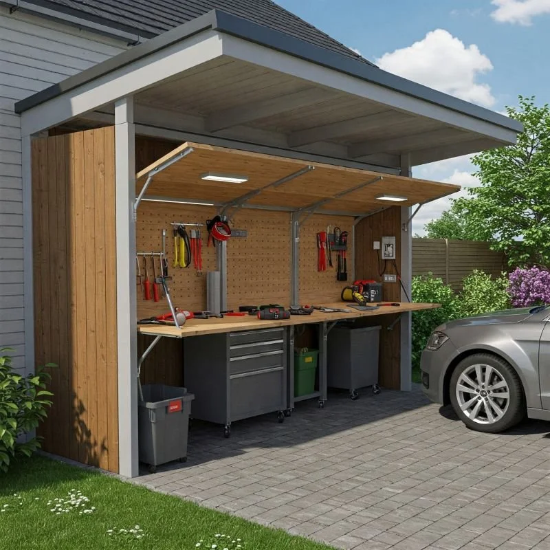 If you’re a DIY enthusiast or simply enjoy tinkering with small projects, a foldable workbench might be your new best friend. Picture a sturdy work surface that flips up when you need it and tucks away flat against the wall when you don’t. This approach leaves your carport floor open for parking or other storage needs while still giving you a dedicated spot to tackle weekend tasks. Most foldable workbenches come equipped with a latch or locking mechanism to keep everything secure, so you won’t have to worry about it crashing down unexpectedly. Not only do these space-saving benches make your carport more versatile, but they also keep tools within arm’s reach, enhancing productivity. It’s the perfect solution if you like to dabble in carpentry, painting, or minor repairs without sacrificing valuable room in your carport.