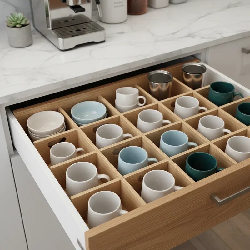 Deep drawers offer hidden storage potential that custom dividers can unlock for your coffee cup collection. These organizational inserts transform chaotic drawer spaces into neat compartments where each cup has its designated spot. Adjustable dividers adapt to various mug sizes, from espresso cups to oversized latte bowls. The enclosed storage protects delicate cups from dust while keeping your countertops and walls clutter-free. Bamboo dividers add eco-friendly elegance, while acrylic options let you see everything at a glance. Installing soft-close drawer slides prevents cups from shifting when opening and closing. This solution works particularly well for valuable or delicate china that you want to protect while maintaining easy access during your daily coffee routine.