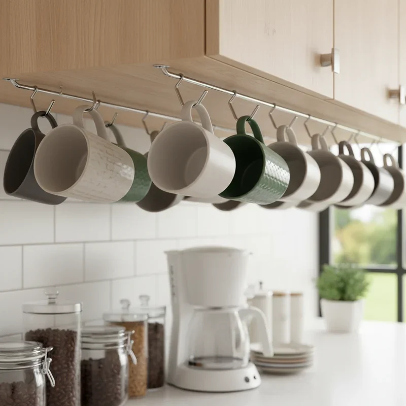 A1: Under-cabinet hooks maximize space without using any counter or wall area effectively.