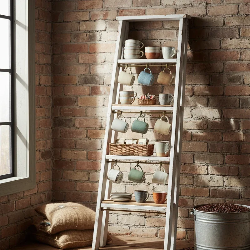 Transform an old wooden ladder into a charming coffee cup display that adds vertical storage with vintage appeal. Lean it against a wall or secure it for safety, then hang cups from the rungs using hooks or simply rest them on the steps. This repurposed storage solution brings farmhouse charm while utilizing often-neglected vertical space. Paint the ladder to match your kitchen's color scheme or leave it naturally weathered for authentic character. Each rung becomes a display shelf, perfect for showcasing special mugs or organizing cups by frequency of use. The ladder's height draws the eye upward, making your kitchen feel larger while adding an unexpected design element that guests will definitely notice and admire.