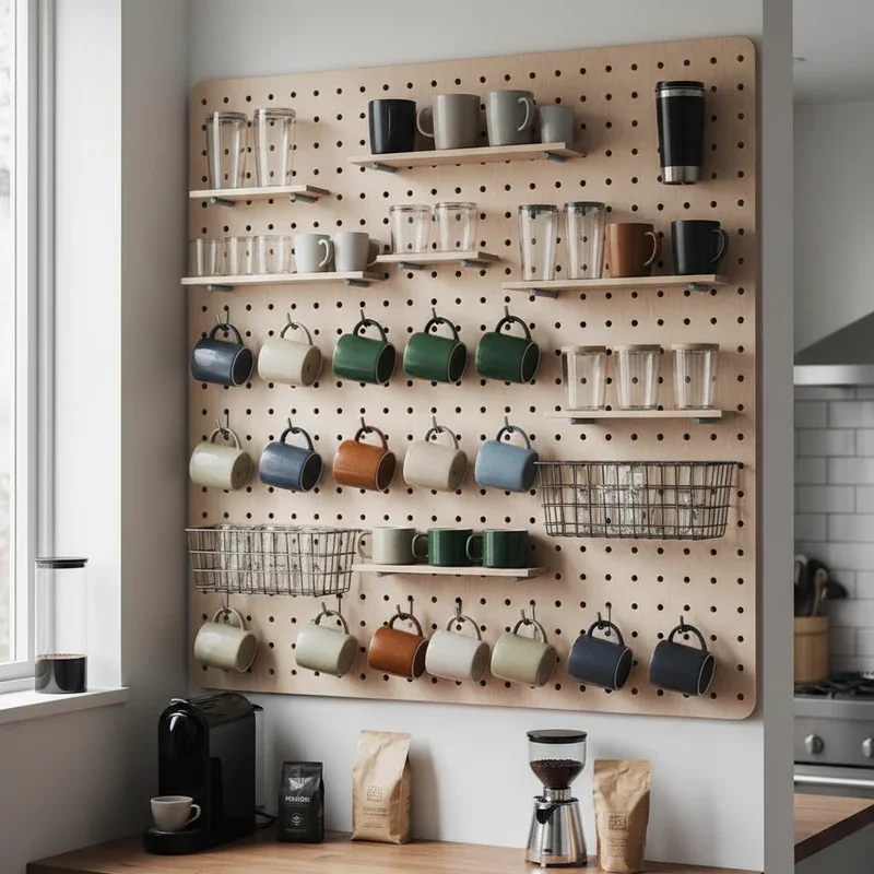 Pegboard isn't just for garages anymore; it's become a trendy, customizable storage solution that adapts to your changing coffee cup collection. Paint it to match your kitchen or create an accent wall that doubles as functional storage. The holes accommodate various peg styles and hooks, allowing you to reconfigure your display whenever inspiration strikes. Add small shelves between pegs for variety, creating zones for different cup styles or coffee accessories. The modular nature means you can start small and expand as your collection grows. Choose from traditional pressed wood, modern metal versions, or even decorative perforated panels that look more like art than storage. This system grows with your needs effortlessly.