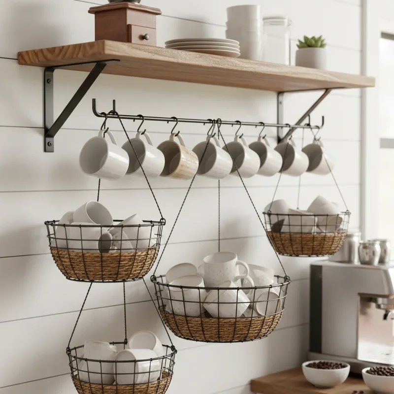 Wire or woven baskets suspended from ceiling hooks or wall brackets offer storage that combines functionality with decorative appeal. These hanging solutions free up valuable counter and cabinet space while adding textural interest to your kitchen. Choose from metal baskets for industrial vibes, woven options for boho charm, or sleek mesh designs for contemporary spaces. Layer baskets at different heights to create visual depth while maximizing vertical storage. The open design allows air circulation, keeping cups fresh and easily visible for quick selection. Some baskets feature multiple tiers, multiplying storage capacity without increasing footprint. This solution works especially well above kitchen islands or in breakfast nooks where overhead space typically goes unused.