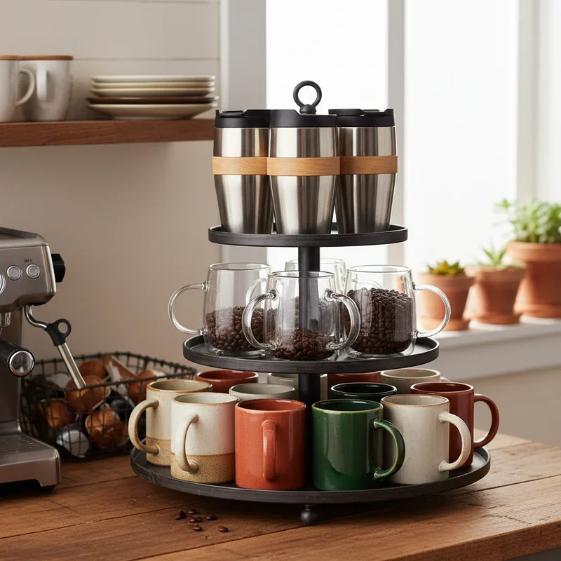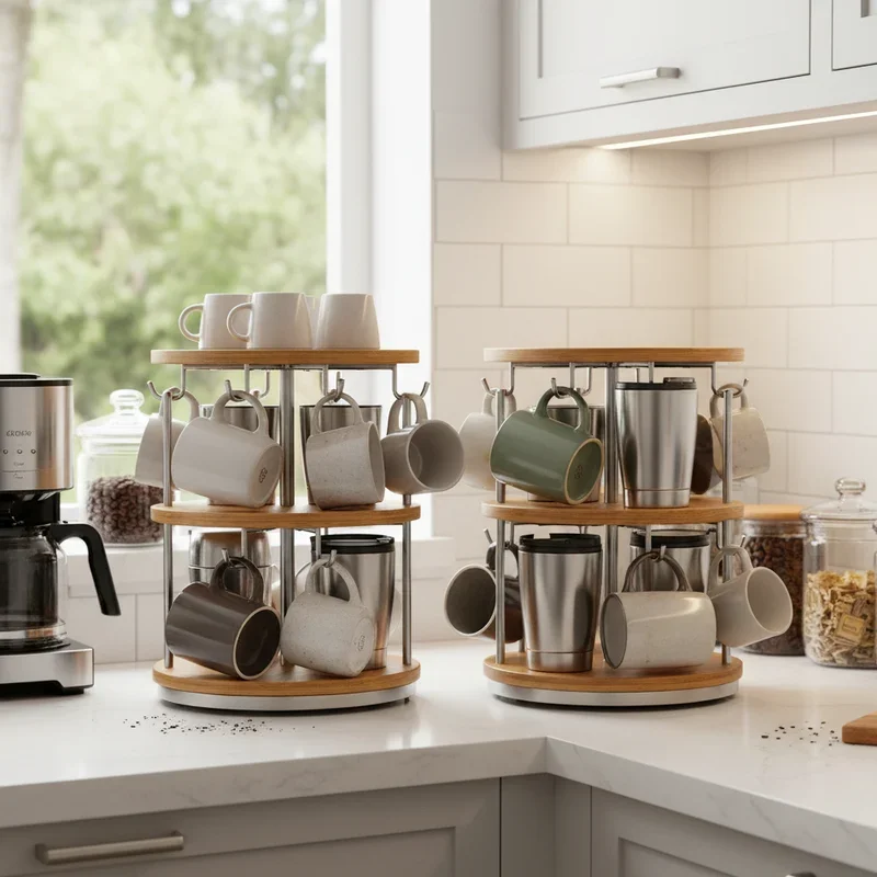Countertop stands with multiple tiers turn limited horizontal space into vertical storage opportunities that keep cups organized and accessible. These stands range from simple two-tier designs to elaborate tree-like structures that hold dozens of cups. Materials vary from bamboo for natural warmth to chrome for modern shine, ensuring options for every kitchen style. The tiered design naturally creates hierarchy, perfect for organizing cups by size or use frequency. Some stands rotate for easy access, while others remain stationary for stability. Position stands near coffee makers for convenient morning routines, or use them as centerpieces that showcase special collections. The portability means you can relocate them easily when entertaining or reorganizing.