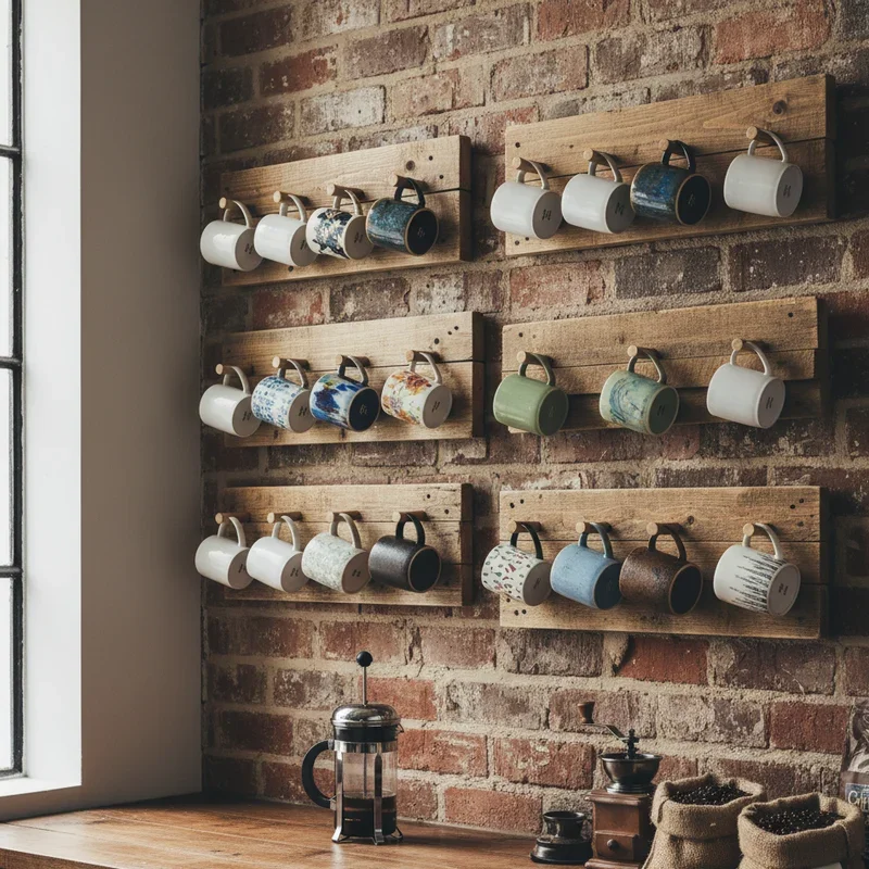 Reclaimed pallet wood transforms into stunning coffee cup racks that bring eco-friendly style to your kitchen. These DIY projects let you customize size, finish, and configuration to perfectly match your space and needs. Sand and seal the wood for a polished look, or embrace the weathered patina for authentic rustic charm. Add hooks, small shelves, or pegs to create multiple storage options within one piece. The horizontal slats naturally create ledges for displaying cups, while the gaps between boards keep the design feeling light and airy. Mount pallets vertically or horizontally, depending on your wall space and cup collection size. This sustainable solution proves that beautiful storage doesn't require a big budget.