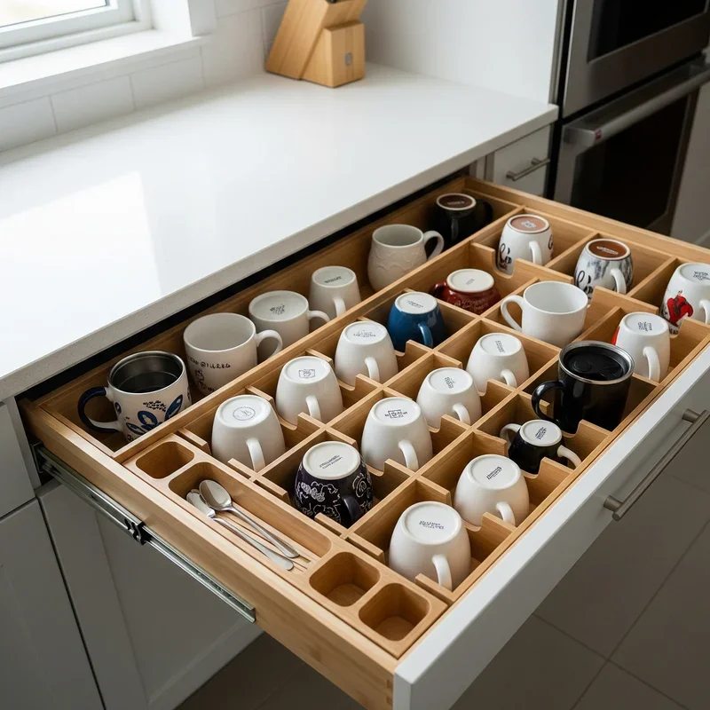 Revolutionary drawer systems transform deep drawers into efficient mug storage with specialized dividers and inserts! These hidden solutions keep countertops clear while protecting mugs from chips and dust. Use adjustable dividers to create custom-sized compartments for different mug dimensions. The bird's-eye view when opening drawers makes selection easy without disturbing other mugs. Line drawers with non-slip mats to prevent sliding when opening and closing. This method works exceptionally well for delicate or valuable mugs needing extra protection. Assign specific spots for each family member's favorite mugs to maintain organization. The concealed storage maintains a minimalist kitchen aesthetic while maximizing functionality. Deep drawers can accommodate even tall travel mugs or oversized soup mugs. Your drawers just graduated from junk collectors to organized mug havens!
