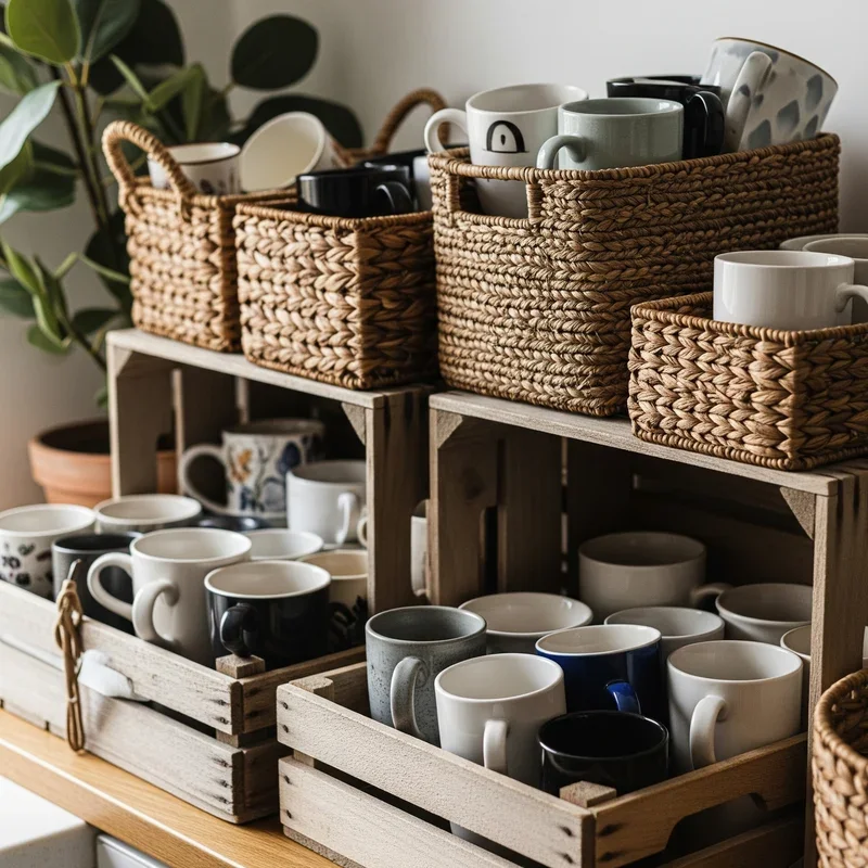 Combine rustic charm with practical storage using baskets and wooden crates for a farmhouse-fresh mug solution! Stack vintage crates on countertops or mount them on walls for instant shelving with character. Line baskets with fabric to protect mugs while adding softness to the display. The contained nature keeps mugs organized while allowing easy transport when setting the table. Mix different basket sizes and materials for an eclectic, collected-over-time appearance. Label baskets by mug type or assign to different family members for personalized storage. The texture variety adds visual interest that plain shelving can't achieve. This budget-friendly option works especially well for seasonal mug rotation. Your kitchen gains cozy, approachable storage that feels both organized and lived-in!