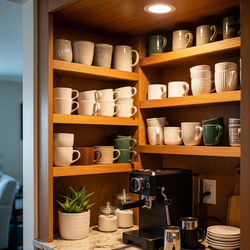 Design a dedicated coffee nook with built-in shelving that creates a permanent home for your mug collection! These custom solutions maximize awkward corners or unused wall recesses, turning them into functional focal points. Include varying shelf heights to accommodate different mug sizes and coffee equipment. The built-in nature creates a cohesive look that appears intentional rather than added on. Add corbels or decorative brackets for architectural interest that elevates the entire kitchen design. Install outlets within the nook for coffee makers and grinders, creating a complete beverage station. Use a mix of open shelving and closed cabinets to balance display with hidden storage. This investment increases home value while solving storage challenges beautifully. Your coffee nook becomes the kitchen's crown jewel where function meets stunning form!