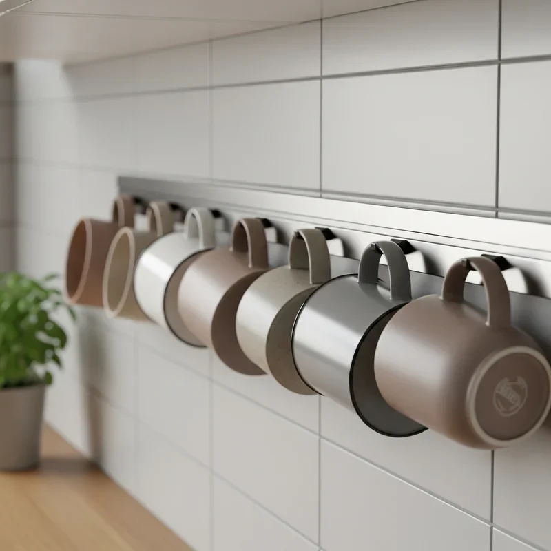 Embrace modern innovation with magnetic strips that create seemingly gravity-defying mug displays! Install strong magnetic strips on walls or inside cabinets, then attach small magnets to mug bottoms. This unique solution creates clean lines and minimalist appeal perfect for contemporary kitchens. The magnetic hold keeps mugs secure while allowing easy one-handed removal and replacement. Space strips horizontally for traditional display or vertically for unexpected visual interest. This method works best with lighter ceramic or plastic mugs rather than heavy stoneware. The installation flexibility means you can create patterns or arrangements that reflect your style. Paint strips to blend with walls or choose contrasting colors for bold statements. Your mugs appear to float on the wall, creating a conversation-starting storage solution!