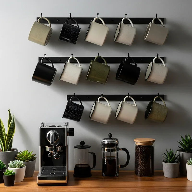 Transform empty wall space into a stylish mug display with mounted racks that blend storage with décor! These dedicated racks come in countless designs, from minimalist metal bars to ornate vintage-inspired pieces. Install them at a comfortable height where you can easily reach your morning brew companion. The exposed storage creates a café-like atmosphere while keeping mugs easily accessible and dust-free. Choose racks with additional features like shelf tops for storing coffee or decorative elements. The linear arrangement creates clean lines that complement modern kitchen designs beautifully. Position racks near your coffee station for convenience or create a gallery wall with multiple racks. Some designs include chalk labels for family members' designated mugs. This visible storage solution encourages you to curate a cohesive mug collection. Your walls become functional art installations!