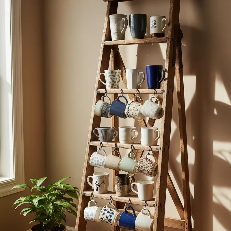 Give an old ladder new life as a quirky, eye-catching mug display that adds vertical storage with character! Lean a wooden ladder against the wall and hang mugs from the rungs using hooks or directly from handles. Paint or distress the ladder to match your kitchen's style, from shabby chic to modern farmhouse. Each rung becomes a display level, creating a tiered effect that showcases your collection beautifully. The angled position naturally displays mugs at different depths, adding dimensional interest. Secure the ladder to the wall for safety, especially in homes with children or pets. Add small shelves between rungs for coffee supplies or decorative elements. This solution works particularly well in kitchens with high ceilings where vertical space goes unused. Your repurposed ladder becomes a conversation piece that happens to store mugs!