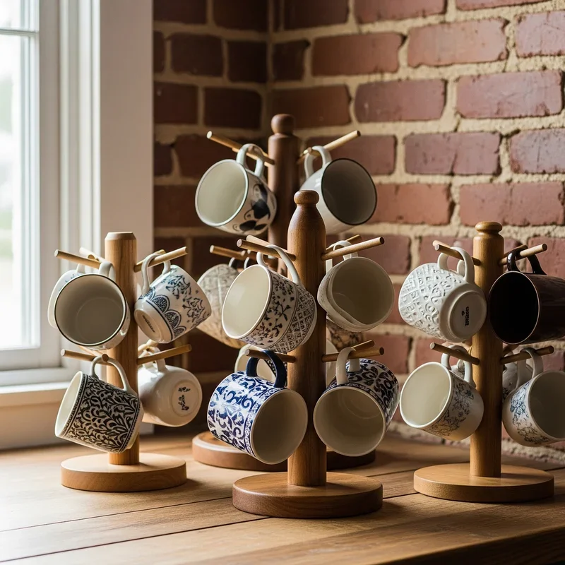 Bring nostalgic charm to your countertop with a classic mug tree that doubles as functional décor! These freestanding beauties hold six to eight mugs while occupying minimal counter space, making them perfect for smaller kitchens. Choose from rustic wood for farmhouse appeal, sleek metal for modern kitchens, or painted versions that pop with personality. The vertical design keeps mugs easily accessible and prevents that dreaded cabinet avalanche. Position your mug tree next to the coffee maker for a complete beverage station that looks intentionally styled. Rotate seasonal mugs or display your best pieces like a curated collection. Some designs include bases that store coffee pods or tea bags, maximizing functionality. The portability means you can move it when entertaining or deep cleaning. Your countertop gains both character and organization with this timeless solution!