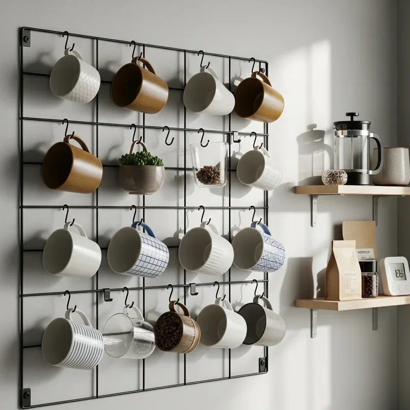 Install a wire grid or metal mesh panel that turns mug storage into an industrial-chic design element! These versatile systems accept various hooks and accessories, allowing complete customization of your storage layout. The grid pattern creates visual interest while maintaining an organized, geometric aesthetic. Hang mugs at different heights to create a dynamic display that draws the eye. Add small shelves or baskets to the grid for coffee accessories and supplies. The open design maintains airflow around mugs, preventing any musty odors from developing. Paint grids to match your décor or leave them raw for authentic industrial appeal. This solution scales easily from small breakfast nook installations to entire coffee bar walls. Include S-hooks in various sizes to accommodate different mug handle styles. Your wall becomes a functional art installation that evolves with your needs!