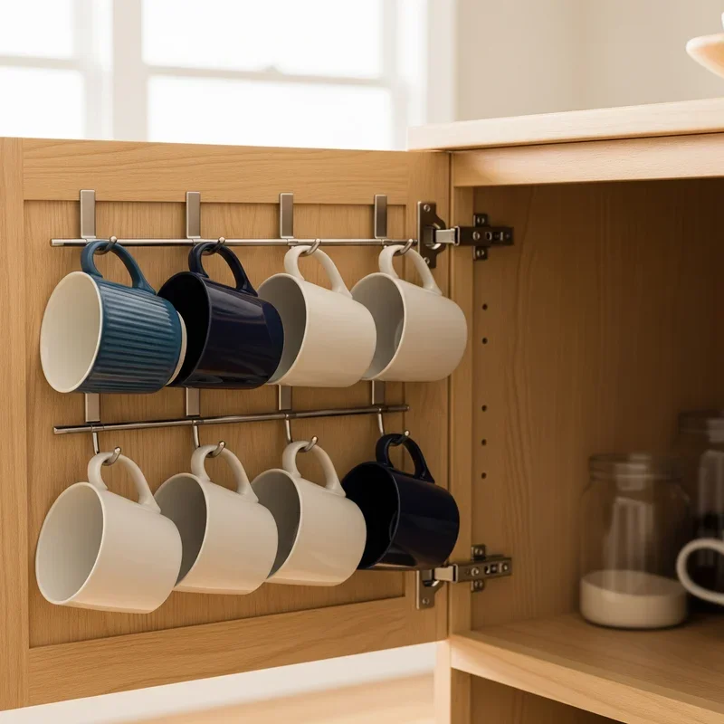 Unlock hidden storage potential by utilizing the inside of cabinet doors for mug organization! Install narrow shelves, racks, or hooks on door backs to create extra storage without sacrificing cabinet space. This invisible solution keeps kitchens looking clean and uncluttered while maximizing every available inch. Choose adjustable systems that can evolve with your changing collection or preferences. The concealed nature makes it perfect for mismatched mugs you love but don't want displayed. Measure carefully to ensure doors can still close properly with mugs in place. Use adhesive hooks for renters who can't make permanent modifications. This method works especially well for smaller mugs or teacups that might get lost in larger cabinets. The door-mounted position makes grabbing your morning mug effortless. Your cabinet doors just became secret storage superheroes!