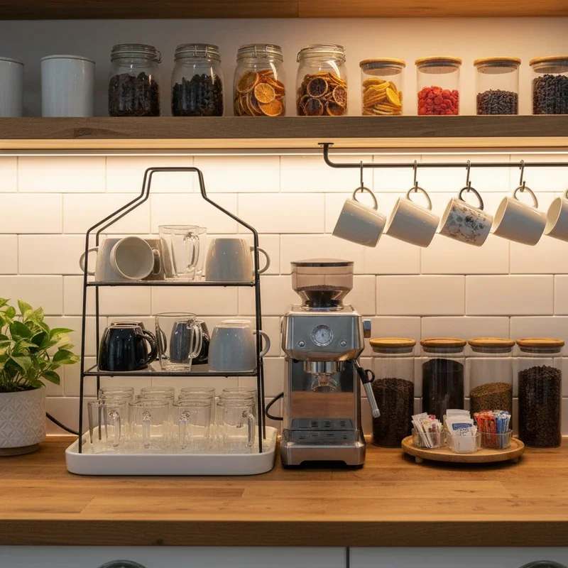 Design a dedicated coffee bar zone where cup storage becomes part of an intentional beverage station experience! Combine various storage methods like hooks, shelves, and baskets to create a comprehensive coffee corner. Position everything at comfortable heights to streamline your morning routine from beans to brew. Include complementary storage for coffee supplies, sweeteners, and stirrers alongside cup organization. Use consistent materials and finishes to create a cohesive look that feels built-in rather than added on. Wall-mounted rails can hold cups while shelves store supplies, maximizing vertical space efficiently. Add a small tray or lazy Susan for daily essentials like favorite mugs and spoons. This centralized approach reduces kitchen traffic during busy mornings when multiple people need coffee. Your coffee bar becomes a destination that makes every brew feel special!