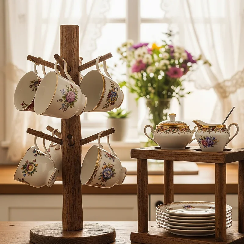 Add nostalgic charm with freestanding cup trees that serve as functional décor pieces on countertops or islands! These vintage-inspired stands typically hold 6-8 cups while occupying minimal counter space. Choose from metal designs for industrial appeal or wooden versions for rustic warmth. The vertical storage keeps cups easily accessible while creating an attractive display that sparks conversation. Position near coffee makers or tea kettles for convenient access during beverage preparation. Some designs include saucer storage at the base, perfect for complete tea sets. The portability allows you to move them when needed for parties or cleaning. Mix vintage finds from thrift stores with modern reproductions for eclectic style. This solution works beautifully for special occasion cups or daily favorites you want within arm's reach. Your countertop gains both function and personality with these charming additions!
