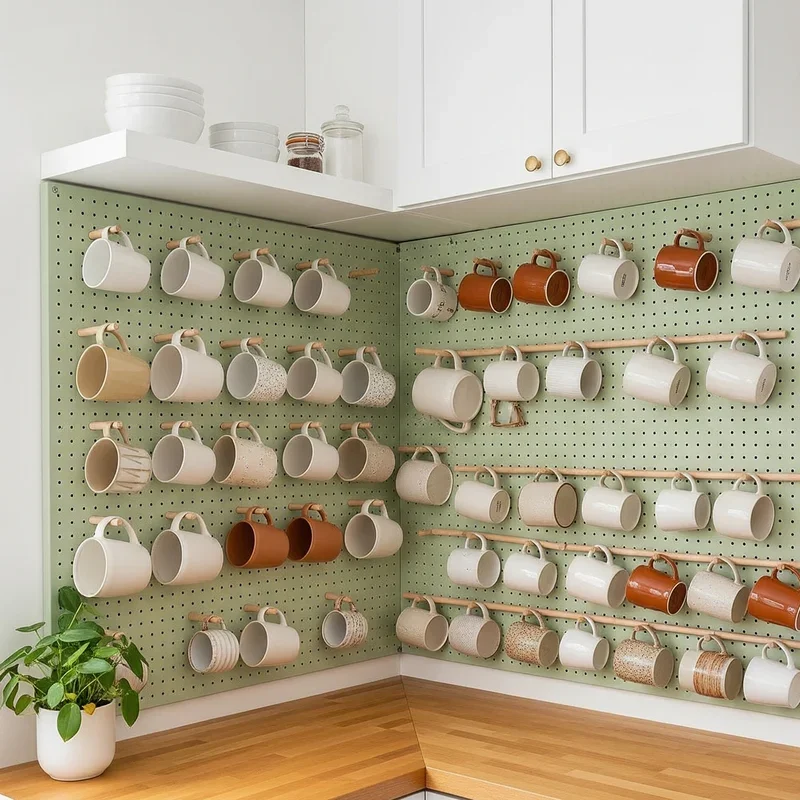 Channel your inner organizational genius with customizable pegboard systems that adapt to your changing needs! Pegboards offer ultimate flexibility, allowing you to rearrange hooks and shelves as your collection grows or shrinks. Paint the pegboard to match your kitchen or create an accent wall with bold color. Use various peg accessories: hooks for handles, small shelves for stackable cups, baskets for tea bags. The modular nature means you can dedicate zones for different cup types or family members. Install it in unused wall space, inside pantries, or even on the side of kitchen islands. Add labels or chalkboard tags for designated spots, perfect for households with specific cup preferences. The industrial look works wonderfully in modern kitchens, while painted versions suit any style. This affordable solution scales from tiny apartment walls to extensive coffee bar setups!