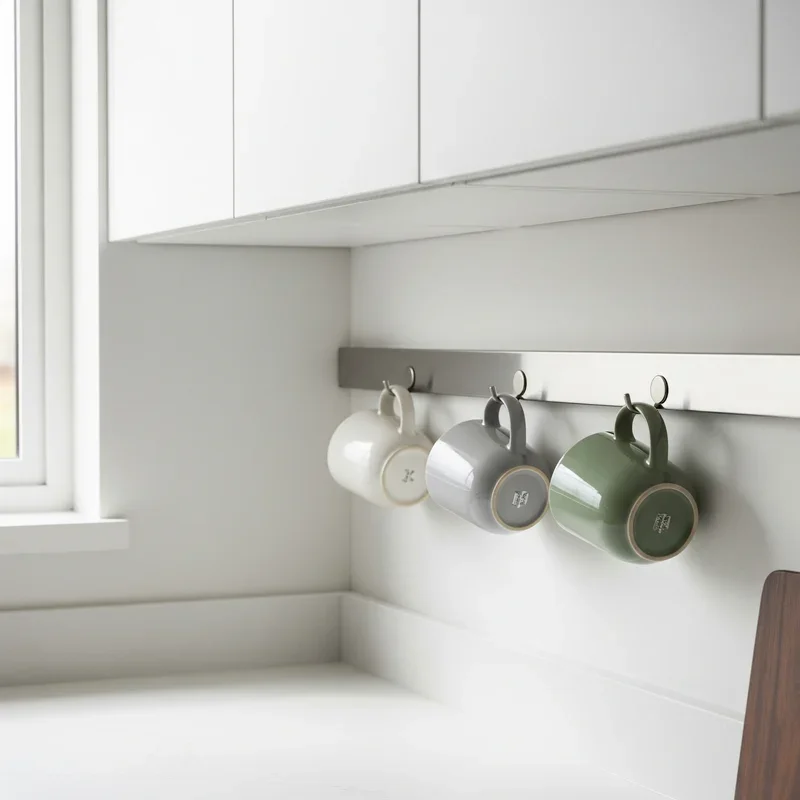 Embrace modern innovation with magnetic strips that hold metal-trimmed or magnetized cups in seemingly gravity-defying displays! Install strong magnetic strips on walls or under cabinets to create unique storage that doubles as art. This works brilliantly for enamel camping cups, metal travel mugs, or cups with added magnetic discs. The linear arrangement creates clean, minimalist lines that suit contemporary kitchens perfectly. Space strips horizontally for traditional display or vertically for unexpected visual interest. The easy grab-and-release mechanism makes this ideal for busy morning routines. Paint strips to match walls for subtle integration or choose contrasting colors for bold statements. This solution keeps counters completely clear while adding an element of surprise to your kitchen. Combine multiple strips at different heights to accommodate various cup sizes and create dynamic wall compositions!