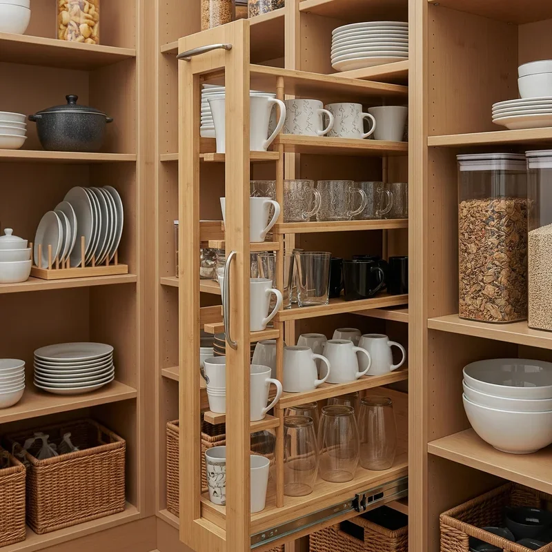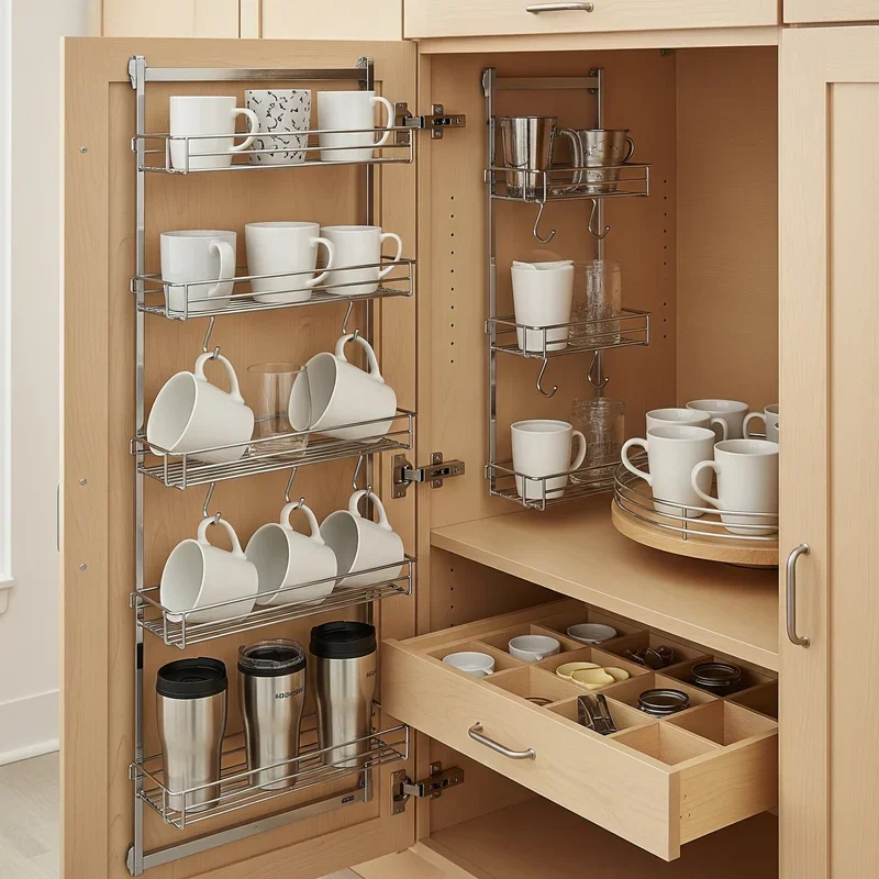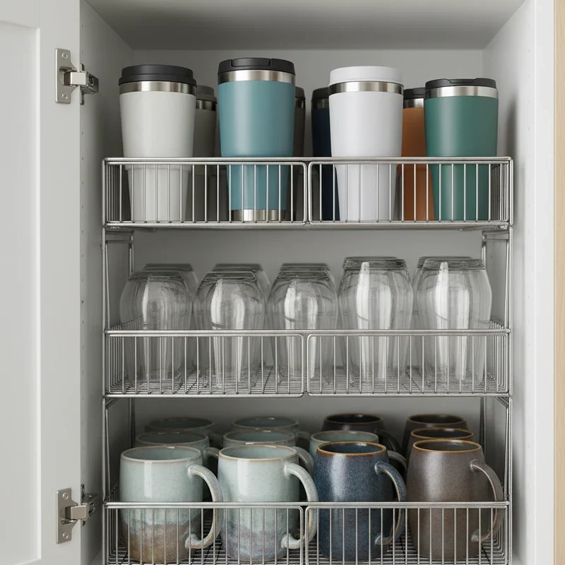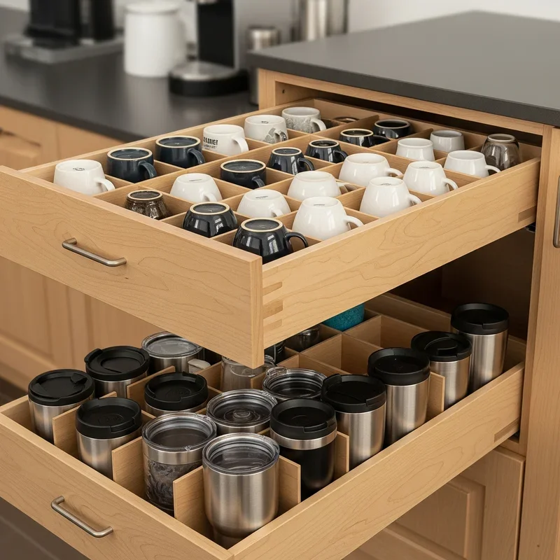 Upgrade standard cabinets with pull-out drawer inserts that bring back-row cups forward with ease! These sliding systems eliminate the need to move front items to access those behind, preventing the dreaded cup avalanche. Install on smooth glides that handle the weight of multiple cups without sticking. Multiple shallow drawers work better than single deep ones for preventing stacking damage. The full-extension feature means every cup remains visible and accessible, encouraging use of your entire collection. Choose wire baskets for modern looks or solid wood for traditional aesthetics. This retrofit solution breathes new life into existing cabinets without full renovation. Include drawer dividers or grippers to prevent cups from sliding during movement. The pull-out mechanism particularly benefits shorter individuals or those with mobility challenges who struggle reaching cabinet depths!
