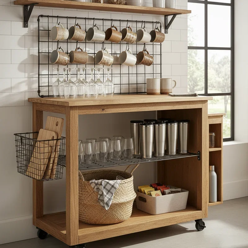 Mobilize your cup storage with a kitchen cart that provides flexible organization wherever you need it! These wheeled wonders offer multiple shelves, hooks, and sometimes drawers for comprehensive storage solutions. Park it near the dishwasher for easy unloading, roll to the dining room for entertaining, or position beside your coffee maker for morning convenience. Choose carts with varied storage options: open shelves for display, closed cabinets for hiding mismatched cups, hooks for hanging favorites. The mobility factor makes deep cleaning easier and allows layout changes without commitment. Butcher block tops provide extra prep space while metal versions offer industrial durability. Style the top shelf with decorative items while keeping functional storage below. This solution particularly benefits small kitchens that need storage to multitask and adapt to different situations!