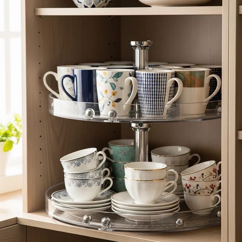 Spin your way to organization heaven with lazy Susan turntables that make every cup easily accessible! These rotating platforms work magic in deep cabinets where cups typically hide in dark corners. Choose two-tiered versions to double storage capacity without sacrificing accessibility. Place frequently used cups on the outer edge, special occasion pieces toward the center. The 360-degree rotation means no more knocking over front cups to reach those in back. Non-slip surfaces or raised edges prevent cups from sliding during rotation. Clear acrylic versions let you see everything at a glance, while bamboo or wood options add warmth. Install them in corner cabinets to transform awkward spaces into functional storage. Group similar cups together on each level for intuitive organization. This solution particularly benefits households with multiple coffee drinkers who need quick morning access!