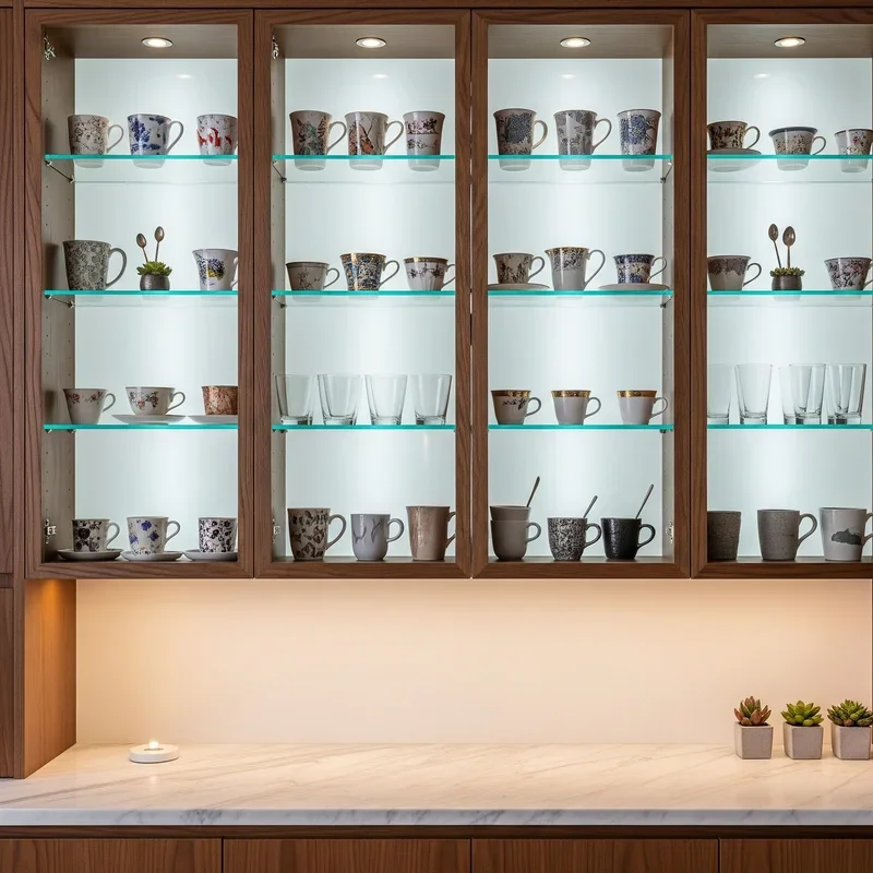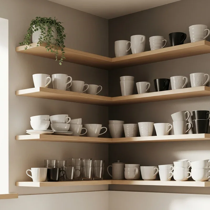 Transform dead corner spaces into functional cup displays with strategically placed floating corner shelves! These triangular or curved shelves fit snugly into corners that typically go unused, creating storage without eating into room space. Stack multiple shelves vertically to create a tower effect that draws the eye upward, making kitchens feel taller. The open design prevents the claustrophobic feeling that corner cabinets sometimes create. Use them to display your prettiest cups or create a dedicated tea corner with cups and accessories. Install at varying heights for visual interest while keeping frequently used items within easy reach. Glass shelves offer a light, airy feel, while wood adds warmth and character. LED spotlights above can turn your corner cup collection into an illuminated focal point. This solution works brilliantly in small kitchens where every square inch counts!