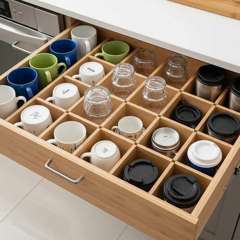 Revolutionize deep drawers with divider systems that keep cups organized and protected from chips! Deep kitchen drawers often become jumbled messes, but adjustable dividers create individual compartments for each cup. This horizontal storage works exceptionally well for valuable china or delicate teacups that need extra protection. Line drawers with non-slip mats to prevent sliding when opening and closing. The bird's-eye view makes selecting cups easy without disturbing others. Create sections based on cup size, use frequency, or family member preferences. Bamboo or wood dividers add natural beauty while protecting cup surfaces. This method keeps cups dust-free and hidden, perfect for minimalist kitchens. Include labels on divider fronts for family members to maintain organization easily. The drawer solution particularly benefits those with back problems who struggle reaching high cabinets!