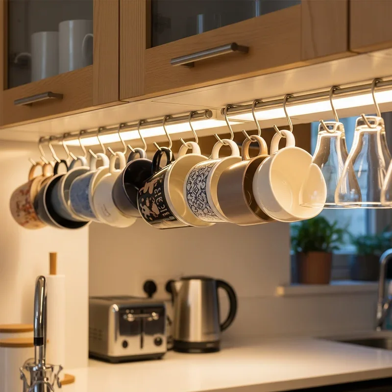 Maximize every inch of vertical space with under-cabinet hooks that keep cups accessible yet out of the way! These simple additions utilize dead space beneath upper cabinets, perfect for frequently used mugs. Install individual hooks or hook rails depending on your cup quantity and cabinet configuration. Space hooks appropriately to prevent cups from clanking together, potentially using rubber bumpers for protection. This solution works especially well near coffee makers or tea stations, creating convenient grab-and-go access. Choose hooks that complement your kitchen hardware for cohesive design, whether that's sleek stainless steel, warm brass, or painted metal. The visibility factor helps you use all your cups rather than reaching for the same few. Consider adding LED strip lighting underneath cabinets to illuminate your hanging cups beautifully. This method keeps countertops clear while adding a café-style charm to your kitchen!